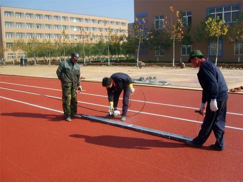 采用国际田联认可的复合结构,上层为PU颗粒或EPDM耐候性环保彩色颗粒混合,机械喷涂,下层为机械摊铺的缓冲底垫。符合专业田径运动员训练标准。标准厚度13mm。